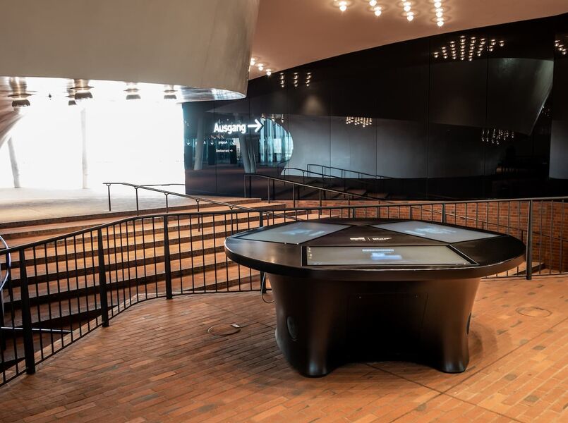 Mitten auf der Plaza der Elbphilharmonie können sich die Besucher des Hamburger Wahrzeichens über den spektakulären Bau informieren. Der Medientisch, an dessen Umsetzung wir beteiligt waren, ermöglicht an drei großen Touch-Monitoren virtuelle Rundgänge durch die Elbphi.